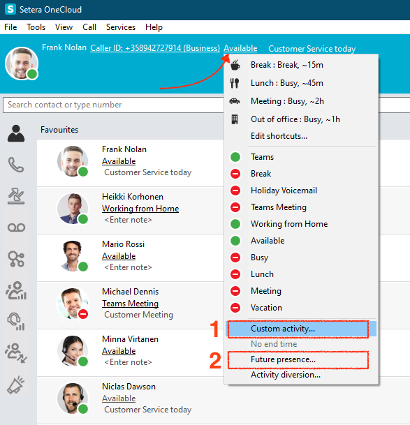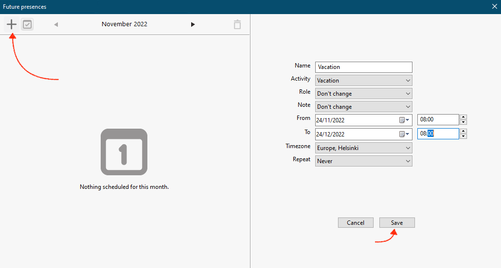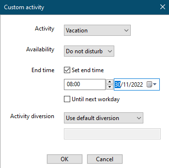 È anche possibile creare 1) Attività personalizzate, ad esempio se si desidera impostare lo stato "Ferie" per 4 settimane a partire da una specifica data e un'ora di fine automatica: