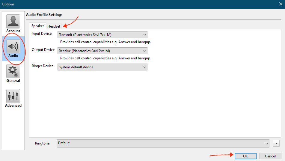 È possibile scegliere le proprie impostazioni per i profili Altoparlante e Cuffia, ad esempio, in modalità Cuffia il suono proviene dalle cuffie, in modalità Altoparlante il suono proviene dagli altoparlanti del computer.