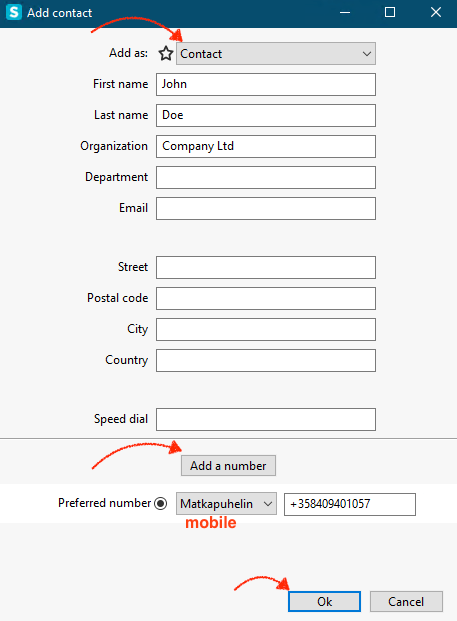 Aggiungere un numero, nel caso di un numero di cellulare selezionare Cellulare come tipo e inserire il numero con il prefisso internazionale e premere OK.