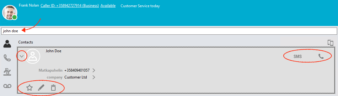 Quando si desidera chiamare o inviare un messaggio SMS a un contatto, è possibile cercare il contatto nel campo di ricerca.