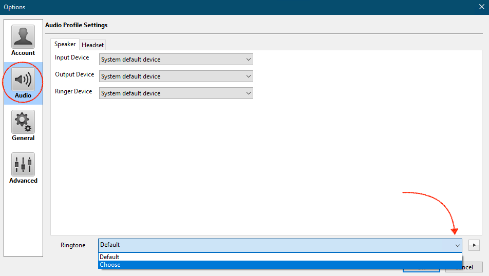 Strumenti -> Opzioni -> Audio -> Suoneria