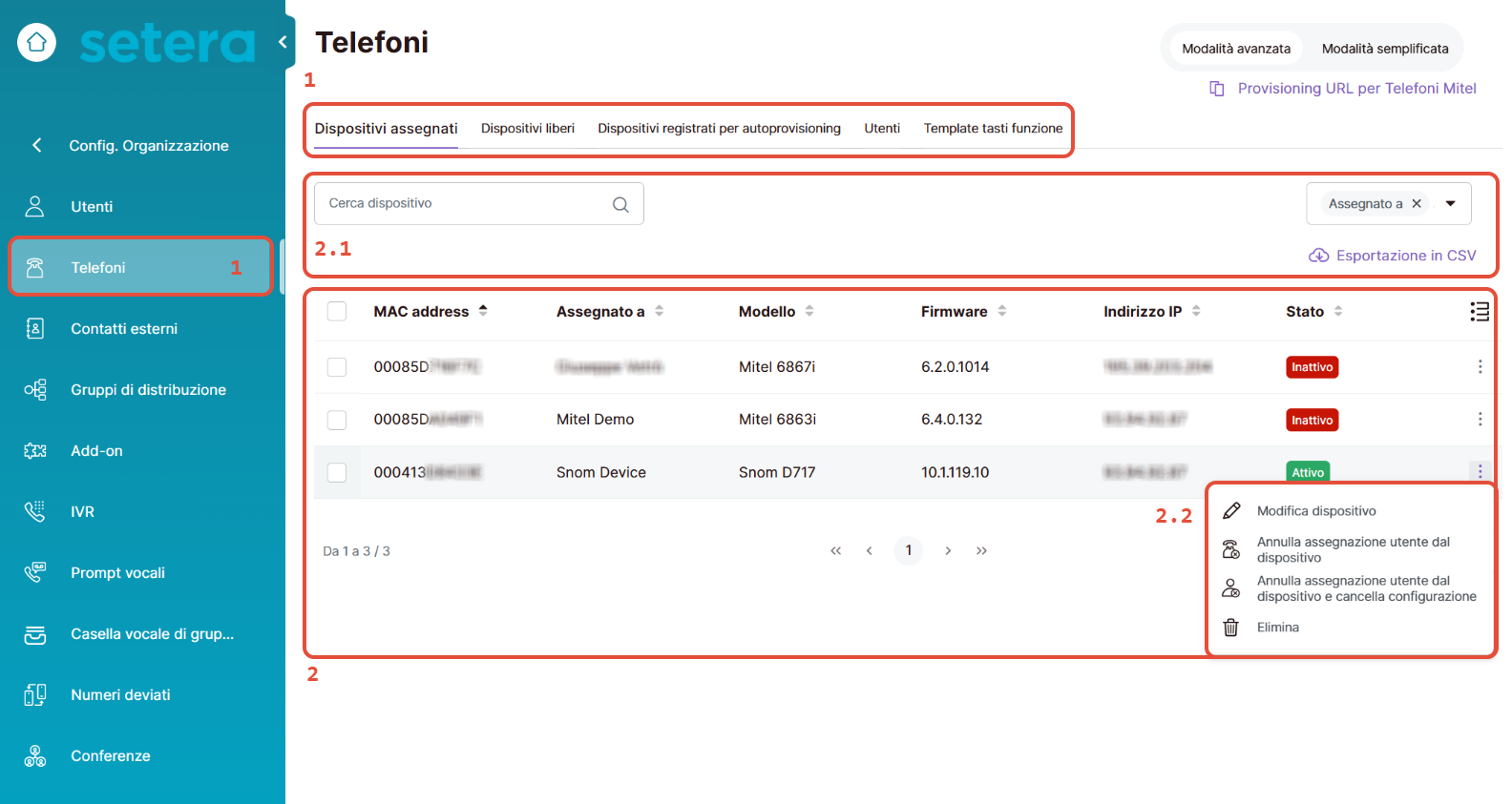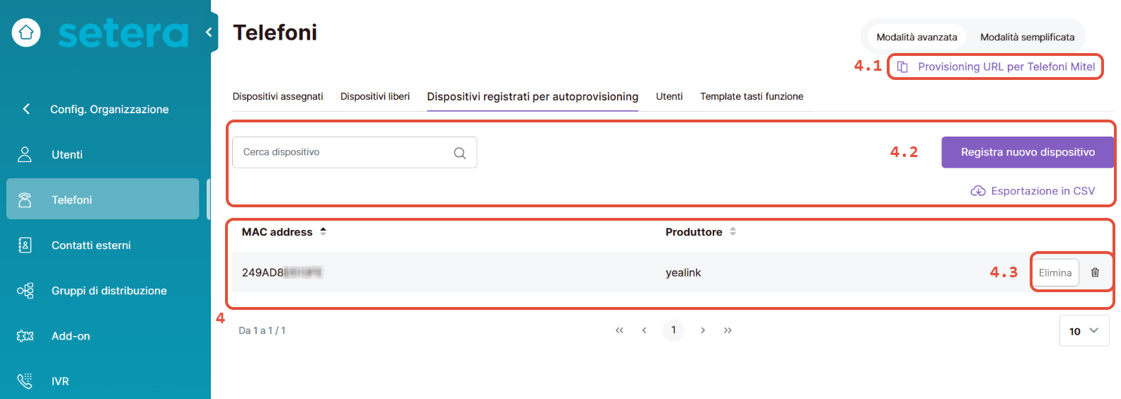 La scheda Dispositivi Registrati per Autoprovisioning consente di registrare i MAC address dei dispositivi che supportano l'autoprovisioning attraverso il portale SMP (alcuni modelli di Snom, Yealink e Poly) e mostra una tabella con i seguenti dati:
