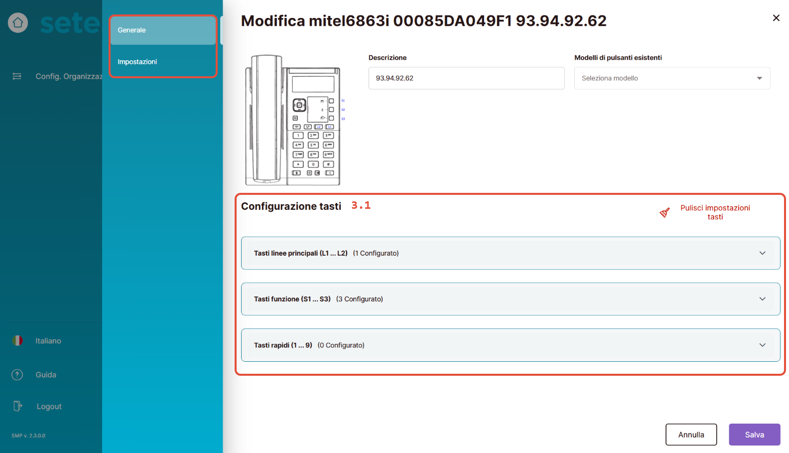 Impostazioni (Firmware, VLAN, Codec, ecc...).