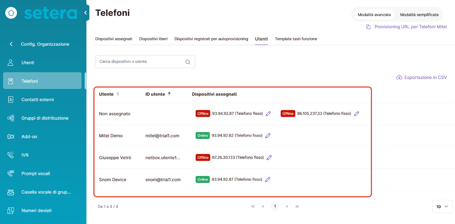 È disponibile l'opzione "Esportazione in CSV" per scaricare l'elenco dei dispositivi assegnati.