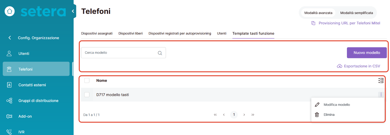 La scheda Template tasti funzione consente la creazione di modelli pre-impostati dei tasti funzione che possono essere rapidamente impostati sui modelli di telefono prestabiliti, inoltre viene mostrato l'elenco dei modelli creati.